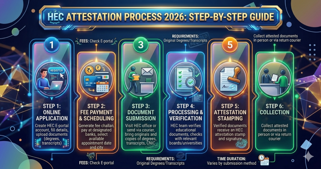 The HEC attestation process 2026 step by step guide is now easier and more streamlined thanks to digital services. By understanding how to apply for HEC degree attestation online Pakistan, preparing the HEC attestation requirements documents list Pakistan 2026, and following the complete procedure for HEC attestation for foreign use, you can complete your attestation smoothly.